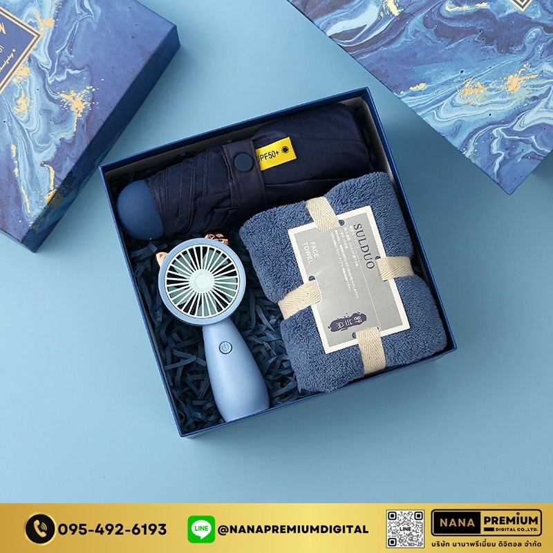 ชุดของขวัญ ของแจกสีน้ำเงินกรม ชุดเซ็ทรับไหว้ ชุดเช็ทผ้าเช็ดตัว+แก้วกาแฟ นมร้อน น้ำผลไม้ เครื่องหนัง